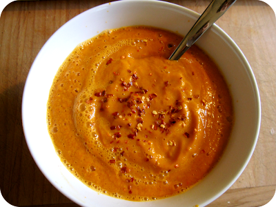 Portland took a break from summer today. I even had to wear a sweater when I went out for a walk this afternoon. The pepper in this soup was nice and warming. This soup would also be nice chilled for those of you having a hot summer. You could also sub out the red pepper flakes with other fresh herbs like basil or thyme for a more cooling flavor. I happen to like a lot of spice no matter what the outside temp.